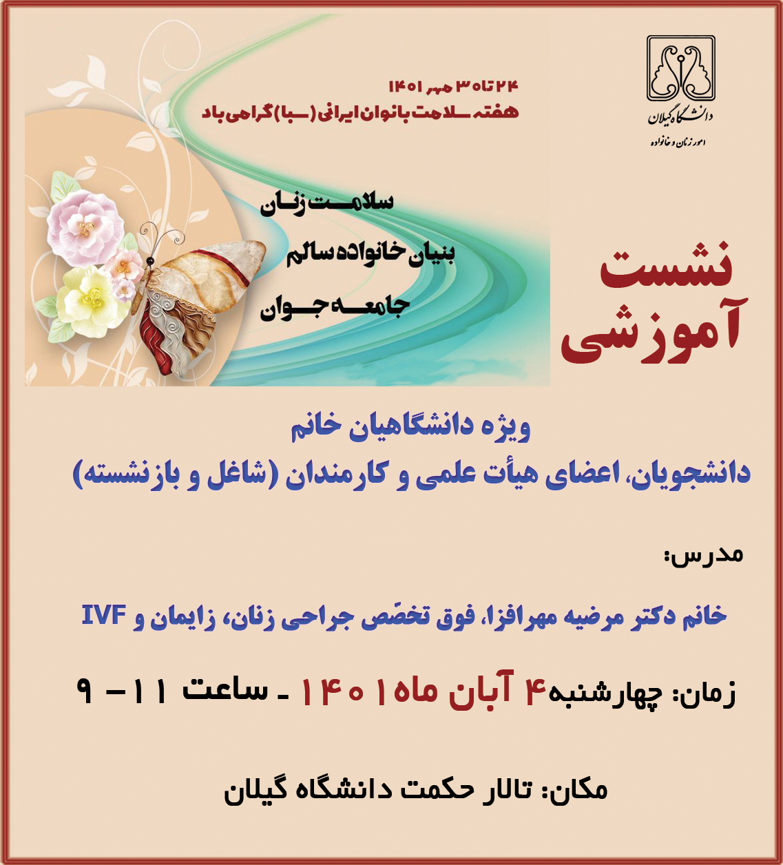 به مناسب هفته سلامت بانوان، دفتر امور زنان و خانواده دانشگاه؛  نشست آموزشی با عنوان" سلامت زنان" ویژه بانوان معزز دانشگاه (کارمندان، اعضای هیات علمی و دانشجوبان و بازنشستگان) با سخنرانی دکتر مهر افزا متخصص زنان و زایمان و نازایی، در روز چهارشنبه 4 آبان ساعت 9 تا 11 صبح در تالار حکمت برگزار می نماید.