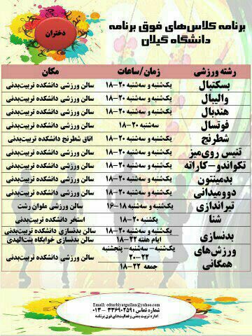 جدول کلاس های ورزشی فوق برنامه دانشگاه گیلان (ویژه دختران) به شرح زیر می باشد: