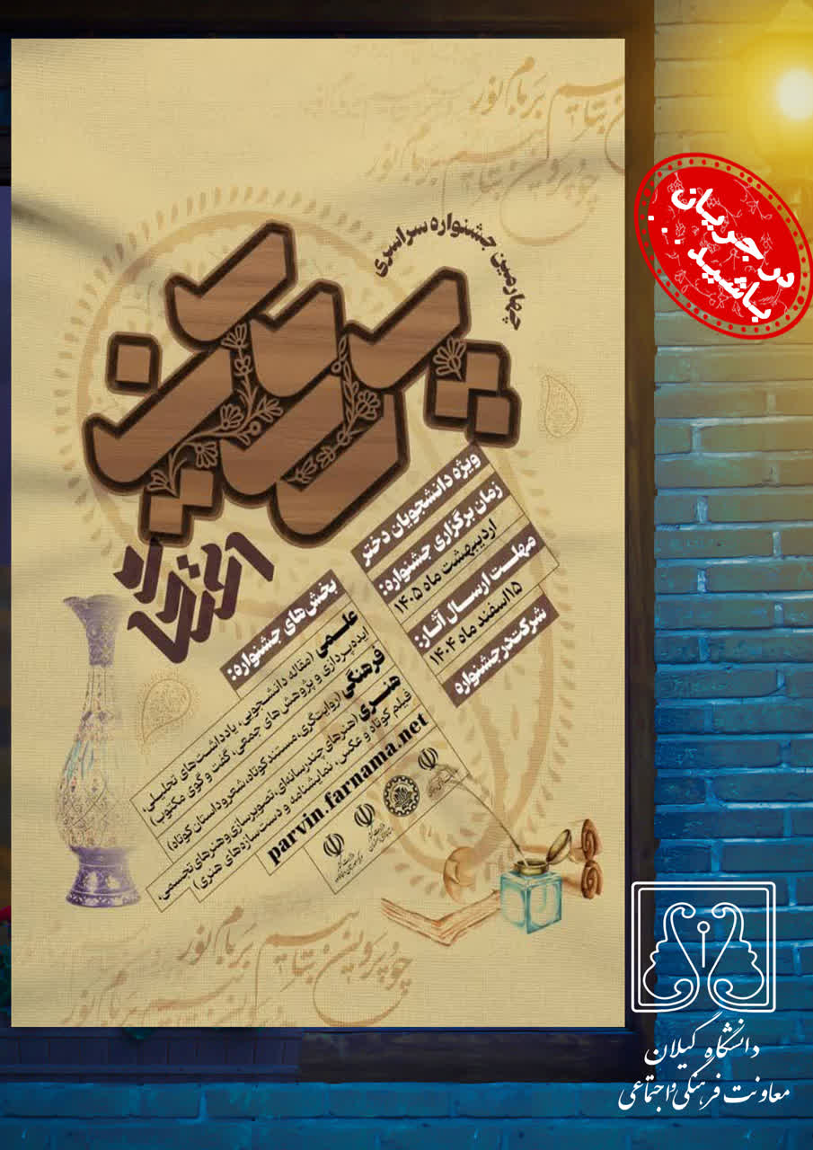 «اطلاعیه» فراخوان چهارمین جشنواره سراسری پروین اعتصامی ویژه دانشجویان دختر منتشر شد. برای کسب اطلاعات بیشتر و ثبت نام به موارد مندرج در پوستر توجه نمایید.